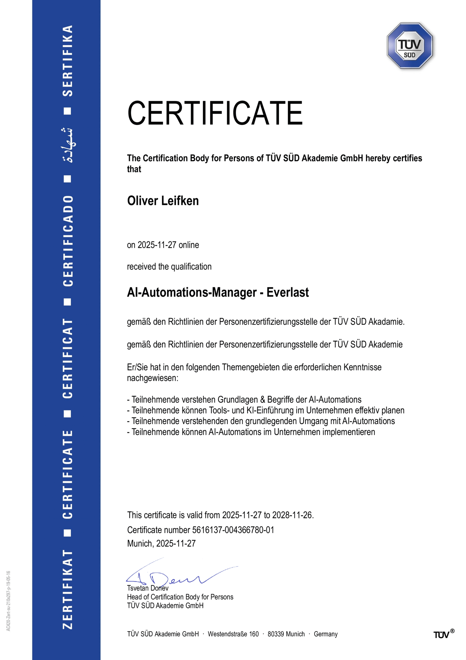 Als TÜV SÜD zertifizierter AI-Automatisierungs-Manager und TÜV Rheinland zertifizierter AI Agent Builder nutze ich Künstliche Intelligenz gezielt zur Effizienzsteigerung. Von Chatbots bis automatisierten Anfragen – deine Website bleibt technologisch zukunftssicher.